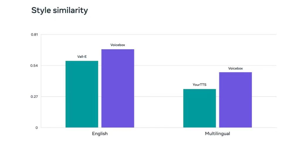 在英语文本到文字的转换过程中,Voicebox的平均单词错误率与音频相似度(相较于真实语音)分别为1.9%和0.681,而目前最先进的英语模型Vall-E,则分别为5.9%和0.580。