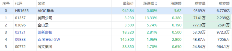 6月20日讯,港股AIGC概念开盘集体冲高,美图公司再升超13%,周内已累涨超30%;截至发稿,金山云涨超5%,创新奇智涨近3%,百度集团-SW、阅文集团涨近2%。