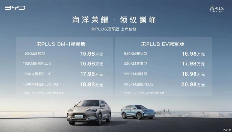 6月20日消息,花旗称,比亚迪推出2023年冠军版的宋Plus DM-i与宋Plus EV,定价极具吸引力,宋Plus整体月销量有望回到4万辆的水平。分析师Jeff Chung等人在报告中表示,预计宋Plus DM-i的月销量将恢复到3.5万辆,宋Plus EV的月销量将恢复到7000辆。