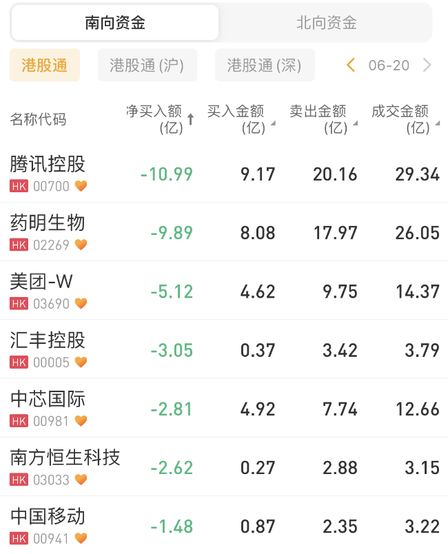 腾讯控股、药明生物、美团-W遭净卖出10.99亿港元、9.89亿港元、5.12亿港元。
