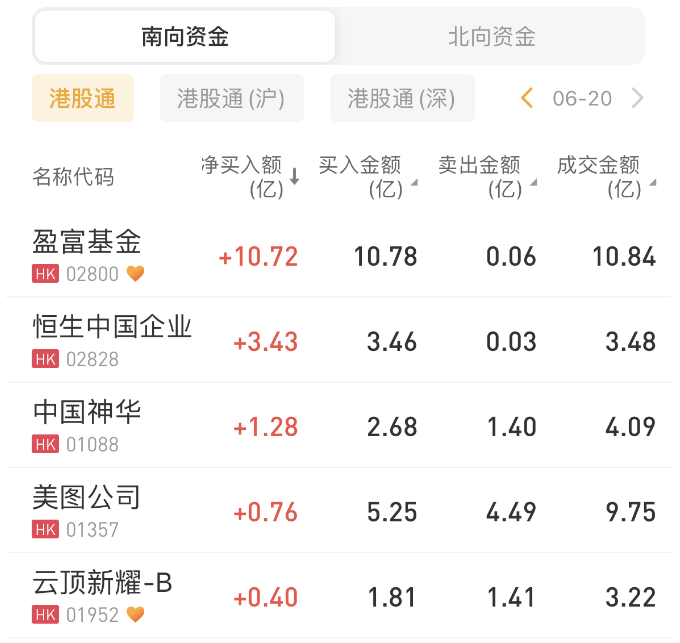 盈富基金、恒生中国企业、中国神华今日分别获南向资金净买入10.72亿港元、3.43亿港元、1.28亿港元;此外,美图公司也获净买入0.76亿港元。