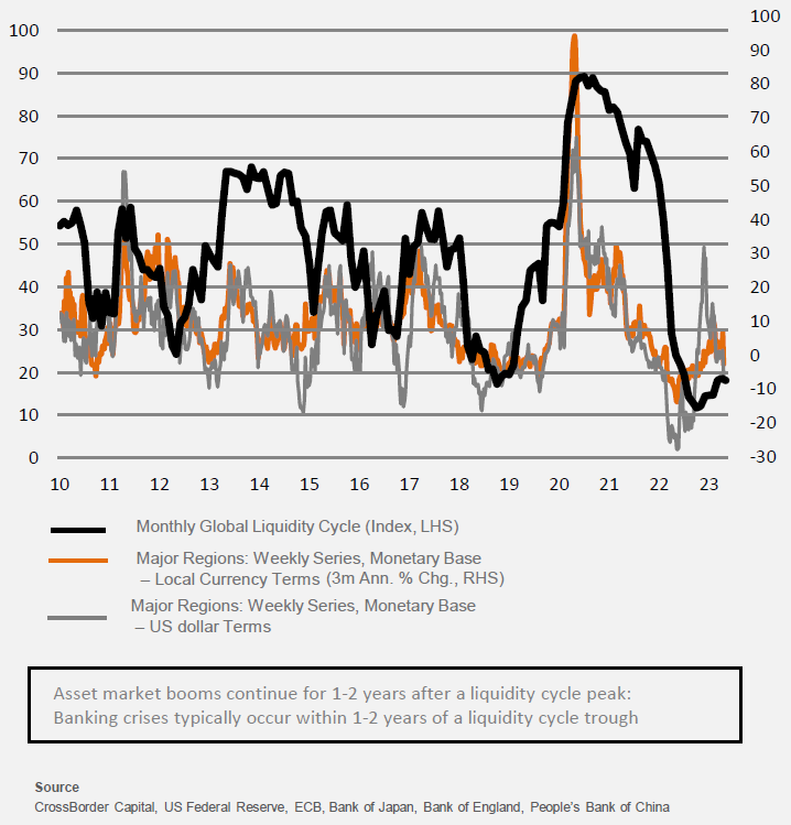 CrossBorder Capital根据央行数据编制的图表显示了不同地区三个月的基础货币滚动增长情况。去年年底,根据这一指标衡量的流动性达到了全球金融危机以来的最高水平。随后,各大央行非但没有收紧流动性,反而略微放松了流动性: