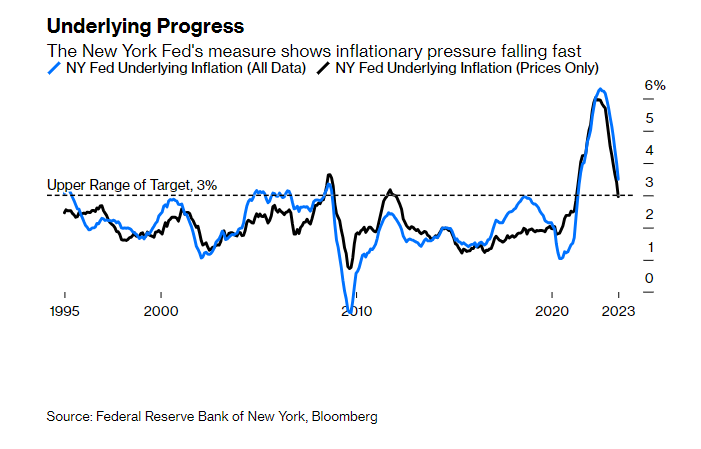 收益率曲线已经连续倒挂了11个月。如果在美联储如此激进的紧缩政策下,在收益率曲线发出如此负面的信号的情况下,能够避免经济衰退,这将是非同寻常的。但至少有一些论点表明这是可能的。例如潜在的通胀指标正在下降,事实上,纽约联储青睐的指标——通过CPI中不同价格之间的相关性,以及与其他宏观经济数据之间的相互关系来衡量的潜在压力目前已经下降到略低于3%的水平,这是美联储目标的上限。