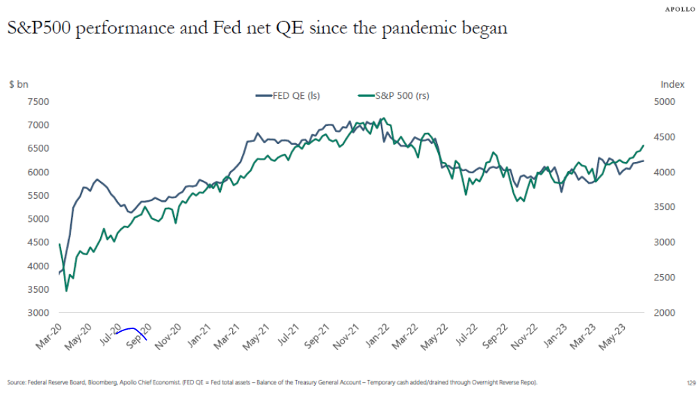 正如阿波罗管理公司的斯洛克(Torsten Slok)指出的那样,自2020年3月疫情开始以来,美联储的净量化宽松规模跟股市之间存在显著的相关性: