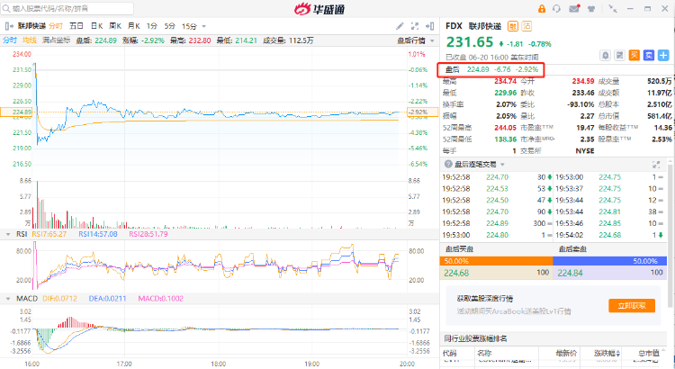截至发稿,联邦快递股价盘后一度跌近6%,现跌3%报224.89美元。