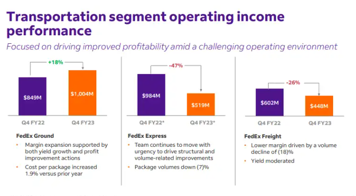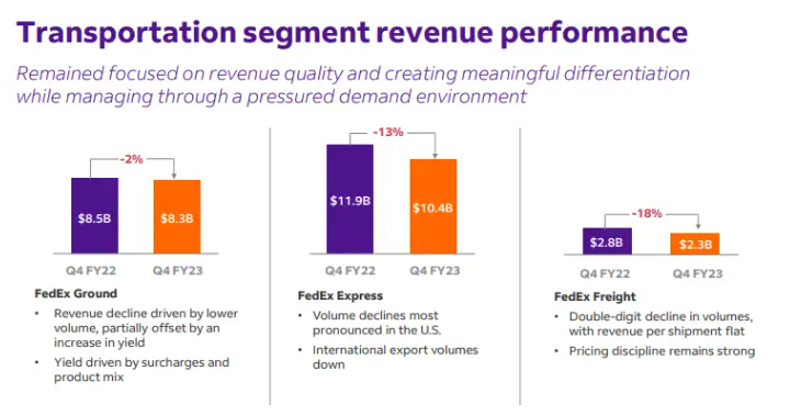 由于全球业务量下降,快递业务的运营业绩有所下降,部分被费用减少和美国国内收益率上升所抵消。地面部门的业绩有所改善,主要是由于每个包裹的收入增加和成本降低,仅部分被包裹数量减少、基础设施成本增加和其他运营费用增加所抵消。货运部门的经营业绩下降主要是由于出货量减少和每批货物重量下降,部分被收入质量的改善所抵消。该公司指出,联邦快递货运公司仍然专注于成本控制,并通过第四轮休假来满足需求,并通过计划永久关闭29个设施来优化网络。