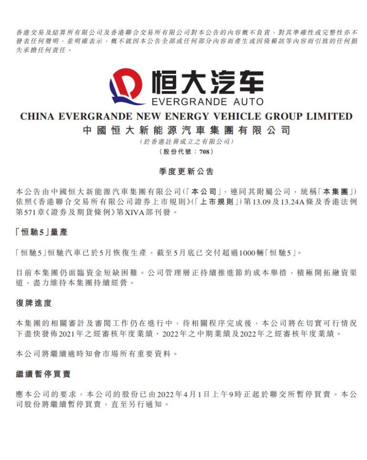 今年 4 月 24 日,恒驰官方公告称由于资金不足,天津工厂暂缓生产恒驰 5。此外,拟以代价 2 元人民币,向中国恒大出售持有 47 个养生空间项目的两家附属公司,即荟保及 FlamingAce 的已发行股份。