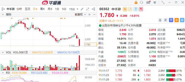 中手游(00302)走势低迷,截至出稿,股价重挫跌14.01%,报1.78港元,成交额9484万港元。