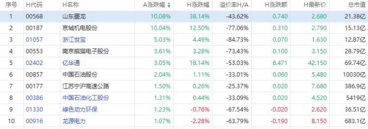截至发稿,山东墨龙A股涨停,H股现涨38.14%;亿华通A股涨3.05%,H股现涨18.14%;京城机电股份A股涨停,H股现涨12.50%。