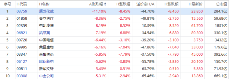 康龙化成A股跌11.10%,H股现跌超8.45%;春立医疗A股跌8.36%,H股现跌2.75%;药明康德A股跌8.19%,H股现跌8.52%。