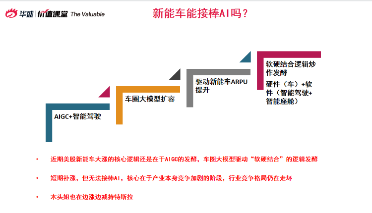 1、近期美股新能车大涨的核心是由于AI gc的炒作发酵,而智能驾驶作为AI的下游应用之一成为了最大的应用场景之一。