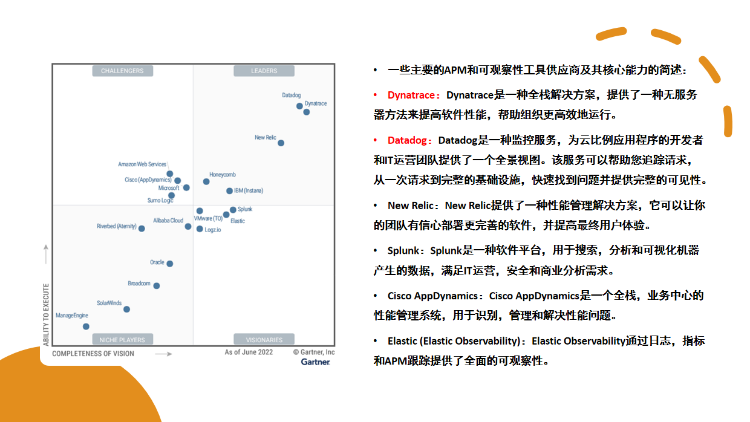 通过分解这个概念,言财老师也指出了APM对于AIGC进一步发展的重要性,目前,市场上主要的APM供应商包括 $SPLK , $DDOG , $DT ,$PD , $NEWR 等等,其中,老师认为 Dynatrace,Datadog和Splunk是领军者: