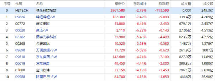 盘面上,科技股跌幅居前,哔哩哔哩跌约7%,京东集团跌约5%,阿里巴巴跌约4%,小米、快手跌3%,网易、腾讯跌2.7%。地产股、医药股走低,融信中国跌约14%,康龙化成跌约8%。新能源汽车购置税减免政策出台,新能源车逆势上扬,造车新势力“蔚小理”皆上涨。