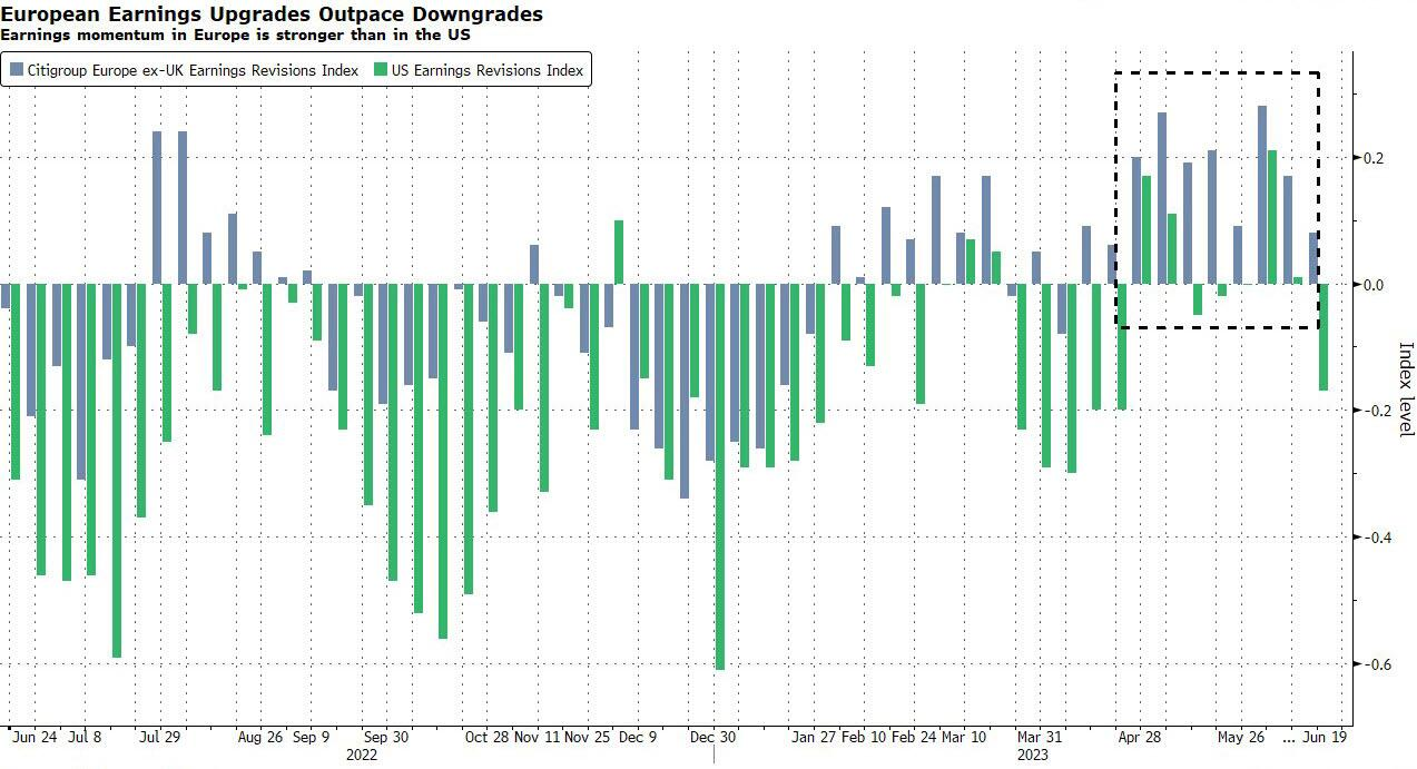 高盛策略师贝尔(Sharon Bell)表示:“欧洲是去年收益修正幅度最大的地区。我们认为欧洲股市有几个支撑因素,包括通胀下降、利率见顶、2023年下半年和2024年(企业)实际收入将出现正增长等。”