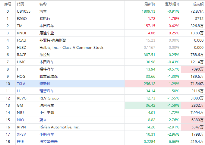 特斯拉股价低开高走,跌逾1%,带动汽车板块集体走低,丰田汽车 $TM 小幅上涨;理想汽车 $LI 跌逾1%;Rivian $RIVN 、蔚来 $NIO 、小鹏汽车 $XPEV 跌逾2%,法拉第未来 $FFIE 跌跌幅扩大至6%。