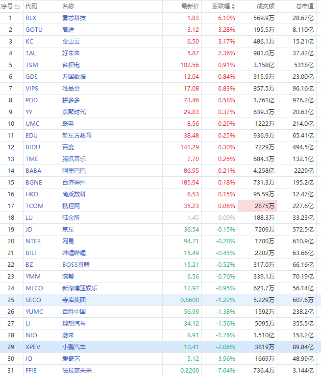 3倍做空富时中国指数ETF $YANG 涨超1%。中概股涨跌分化,优信二手车 $UXIN 涨超13%,雾芯科技 $RLX 涨超6%,金山云 $KC 涨超3%,台积电 $TSM 涨近1%,百度 $BIDU 跟涨。