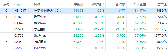 医药外包概念板块近日持续走弱,截至发稿,昭衍新药跌超11%,维亚生物跌8%,泰格医药跌5.83%,康龙化成跌近3%,药明康德跌1.94%.这或许与医药行业订单减少和融资环境不佳有关。