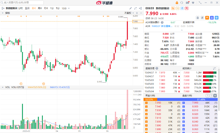6月23日消息,新创建集团(00659)早盘逆市走高,股价一度涨超7%。该股午后停牌,原因有待公布。截至停牌前,涨6.68%,报7.99港元,成交额9921.18万港元。