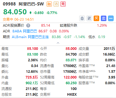 重磅科技股方面,阿里( $89988.HK )亦同样跌第四天,内媒指今年淘宝天猫618在用户、商家规模、成交三项主要指标皆正增长。股价方面,上周三阿里失守10天线后,今早进一步下跌考验20天线83.5港元。