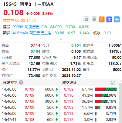 如看淡阿里可留意阿里认沽证( $15645.HK ),行使价77.88港元,2023年11月到期,实际杠杆4.9倍;阿里回调亦蒸发一半6月升幅,如博取反弹可留意阿里认购证( $29079.HK ),行使价92.88港元,2023年12月到期,实际杠杆4.9倍。