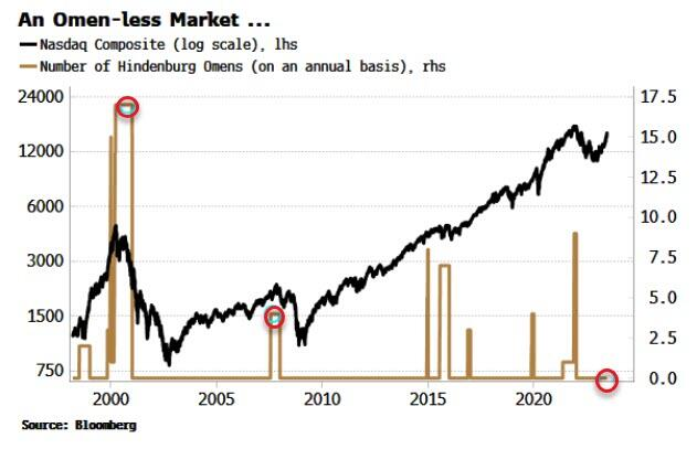“兴登堡凶兆”(Hindenburg Omen)是一个著名的技术指标,是一种声称可预测美国股市出现股灾的技术分析。下图统计了纳指每年出现“兴登堡凶兆”的次数。可以看出,在2000年和2007年触顶之前,凶兆出现的数量有所增加。而当前仍是零。