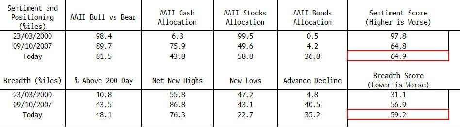 此外,从宽度、仓位和人气指标来看,今天的市场并不像2000年或2007年那样脆弱。下表显示了衡量股市人气和宽度的运行百分位数。
