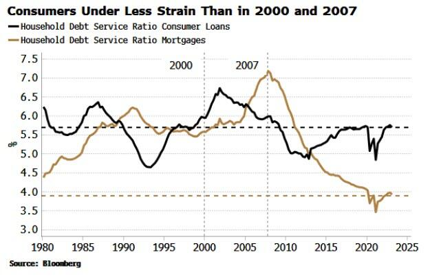 尽管利率迅速上升,但消费者贷款及按揭的偿债保障比率比2000年和2007年都要低,一般来说,该比率越低,说明偿债能力越强。