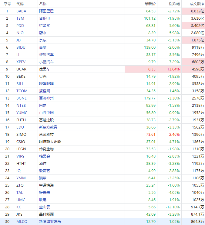 3倍做空富时中国指数ETF $YANG 涨超1%。中概股多数走低,次新股优品车 $UCAR 大涨13%,台积电 $TSM 跌超1%,阿里巴巴 $BABA 、百度 $BIDU 、哔哩哔哩 $BILI 跌超2%,知乎 $ZH 跌逾3%,拼多多 $PDD 跌超5%,雾芯科技 $RLX 涨超6%,金山云 $KC 跌超11%。