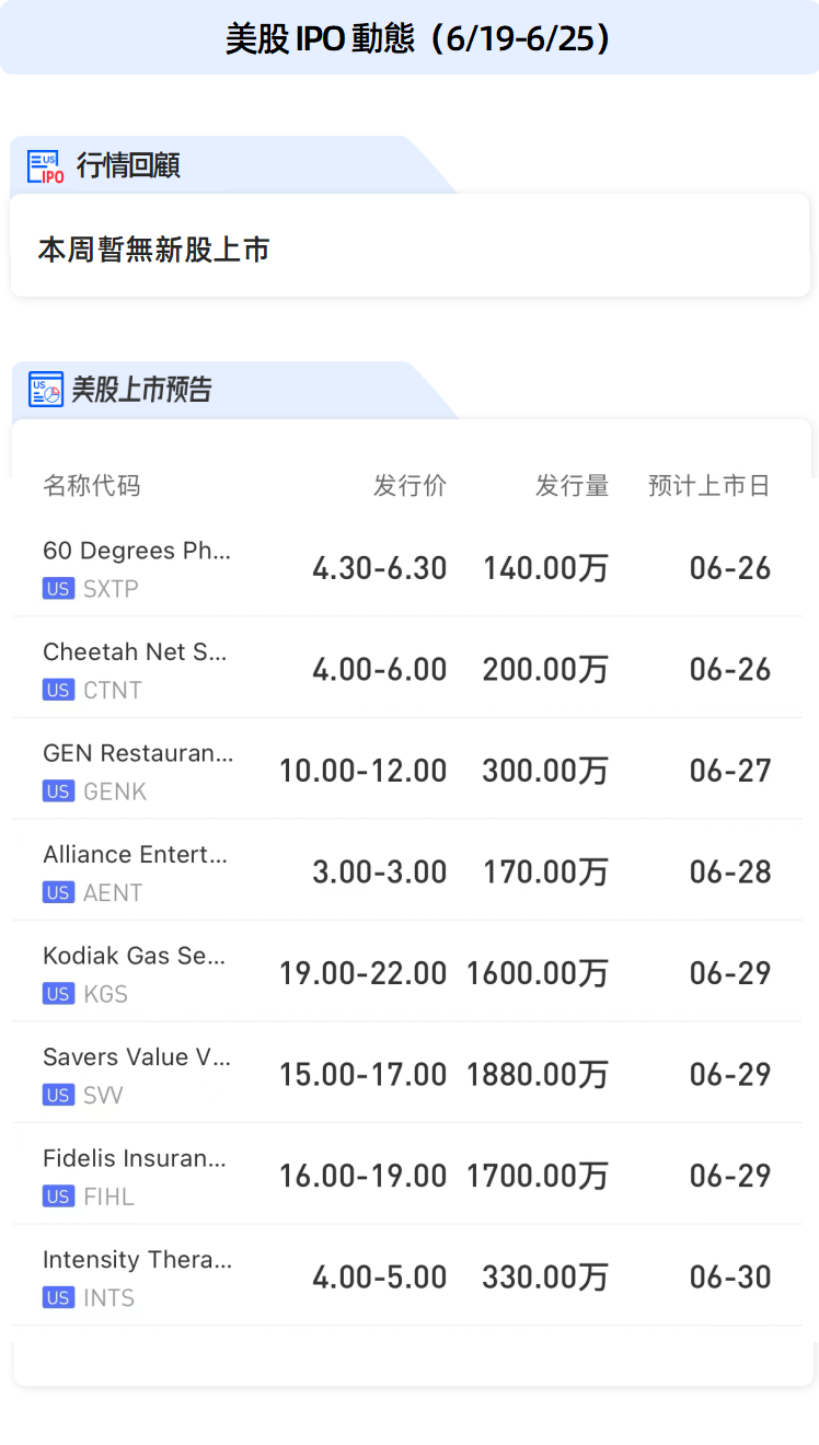 截至6月25日,接下来预计有8只美股上市,包括60 Degrees Pharma、Cheetah Net Supply Chain Service INC. $CTNT 、 GEN Restaurant $GENK 、Alliance Entertainment Holding Corporation $AENT 、Kodiak Gas Services, LLC $KGS 、Savers Value Village, Inc $SVV .、Fidelis Insurance Holdings $FIHL 、Intensity Therapeutics Inc $INTS 等。