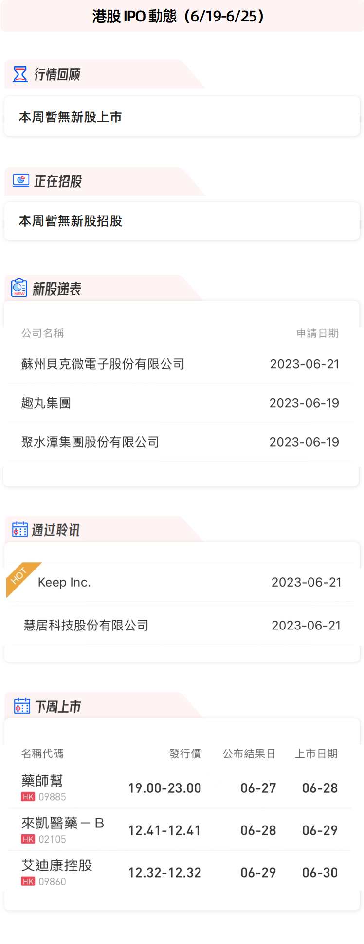 截至6月25日,周内有6家公司向港交所递交上市申请,包括趣丸集团、聚水潭、贝克微电子、永兴东润、亿腾医药、多点数智等