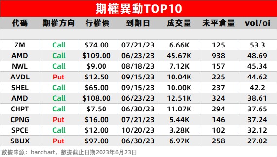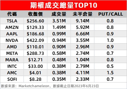 2、亚马逊收跌0.63%,成交93.32亿美元。上周四亚马逊云业务部门AWS表示,将拨款1亿美元建立一个中心,帮助企业使用生成式人工智能(AIGC)。这是亚马逊与谷歌和微软竞争人工智能领域制高点的又一重要举措。到目前为止,微软和谷歌已经公开发布了各自的生成式AI产品。期权方面,亚马逊总成交量挤掉英伟达进入前二。