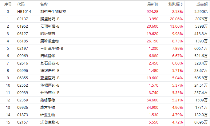 华盛资讯6月26日消息,腾盛博药-B涨逾16%,云顶新耀-B涨超13%,昭衍新药涨超9%,康希诺生物涨超8%,基石药业-B涨超6%,三叶草生物-B涨超7%。
