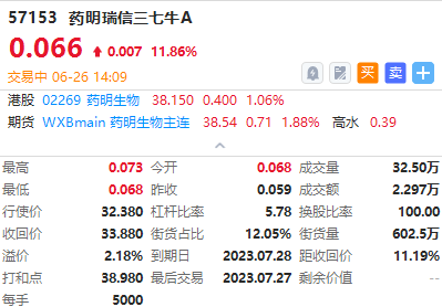 康方生物( $09926.HK )曾高见35元以上,升幅超过6%,一举突破10天、20天和250天线。看好可留意康方购28102,行使价35.88港元,23年12月到期。