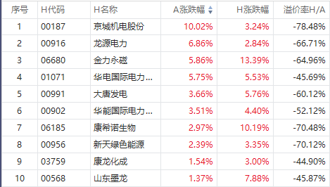 截至发稿,京城机电股份A股涨停,H股现涨3.24%;龙源电力A股涨6.86%,H股现涨2.84%;金力永磁A股涨5.86%,H股现涨13.39%。