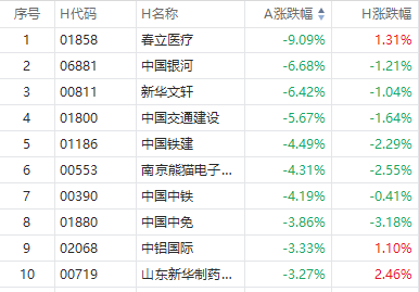 春立医疗A股跌9.09%,H股现涨1.31%;中国银河A股跌6.68%,H股现跌1.21%,新华文轩A股跌6.42%,H股现跌1.04%。
