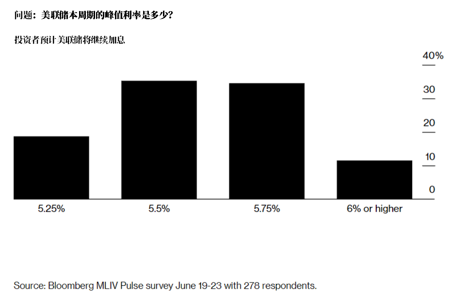 几乎一半的受访者预计美联储至少还会加息两次,而只有19%的人认为加息周期已经完成。对于就在本月还押注年底前降息的市场来说,这是一个显著的转变。去年年底,大多数受访者预计主要利率将达到5.25%或更低的峰值。