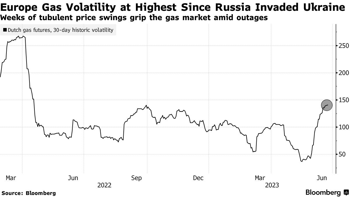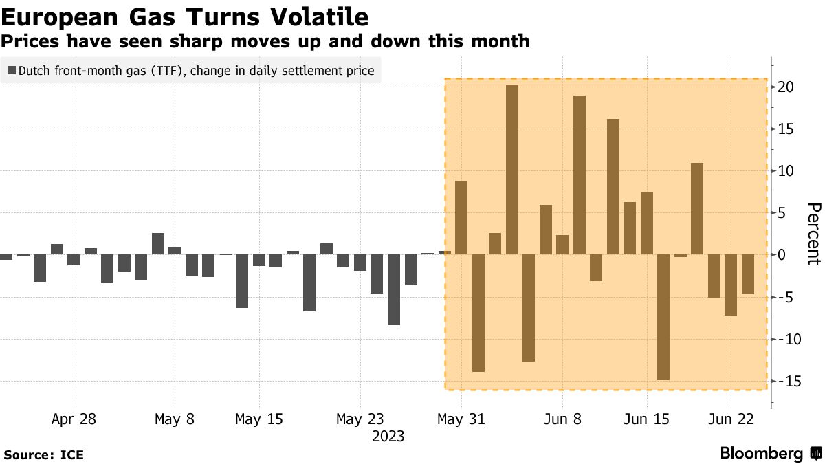 而在俄罗斯内乱将欧洲天然气价格推高8.4%之前,动荡就已经很明显了,主要生产国挪威的长期停产结束了市场长期的平静。对供应的担忧促使押注天然气下跌的投机者争相买入期货以回补头寸,空头回补加剧了价格波动。6月15日,天然气价格上涨了30%,第二天下跌了20%以上。