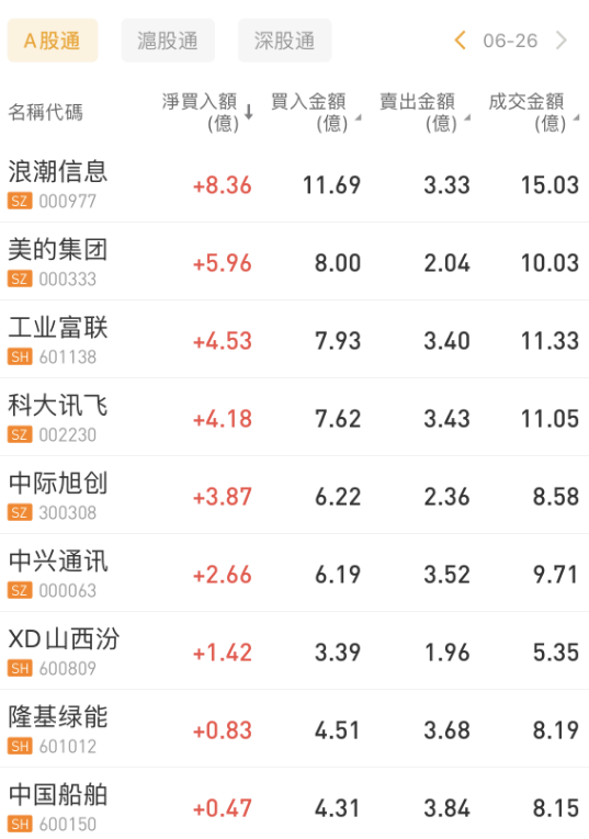 北上资金今日净买入21.17亿元。浪潮信息、美的集团、工业富联分别获净买入8.36亿元、5.96亿元、4.53亿元。五粮液净卖出额居首,金额为7.44亿元。