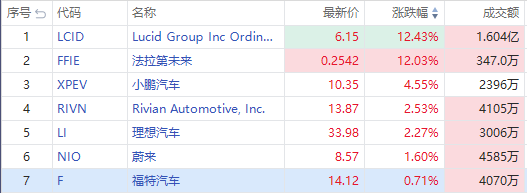 其他个股方面,法拉第未来涨超12%,小鹏汽车涨超4%,Rivian、理想汽车涨超2%,蔚来、福特汽车跟涨。