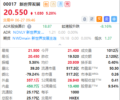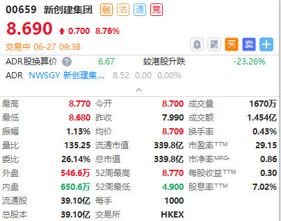 6月27日消息,新创建集团(00659)、新世界发展(00017)早盘复牌,截至发稿,新创建集团涨8.76%,报8.69港元;新世界发展涨5.28%,报20.55港元。