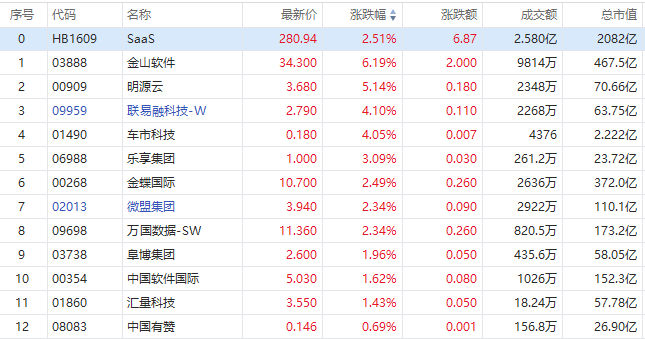 华盛资讯6月27日资讯,港股Saas概念股走高,截至发稿,金山软件涨6.19%报34.3港元每股,成交额0.98亿港元。明源云涨超5%,联易融科技涨4%,金蝶国际、万国数据-SW涨逾2%,微盟集团(02013)走势向好,涨2.34%报3.94港元,中国有赞跟涨。