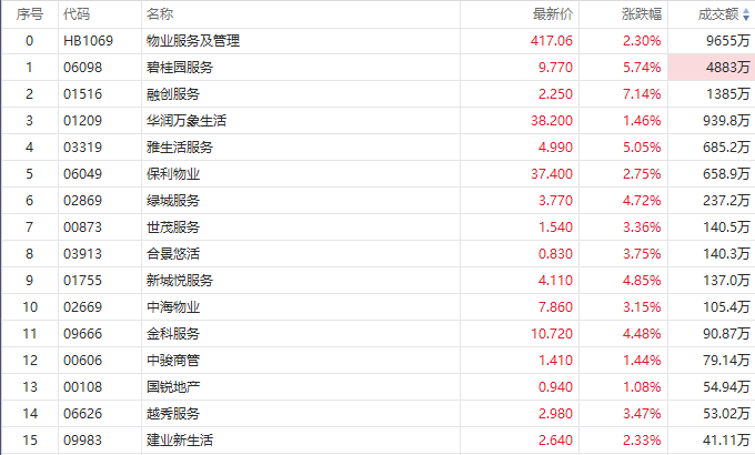 物管股随之走高,融创服务涨逾6%,碧桂园服务、雅生活服务涨逾5%,绿城服务涨逾4%,世贸服务涨逾3%,保利物业涨逾2%。