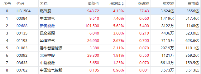6月27日,港股中国燃气涨7.46%报9.51港元每股,成交额1.419亿港元。其他燃气股方面,新奥能源涨5.62%报101.5港元每股,昆仑能源涨超3%,华润燃气涨2.67%,中裕能源跟涨。