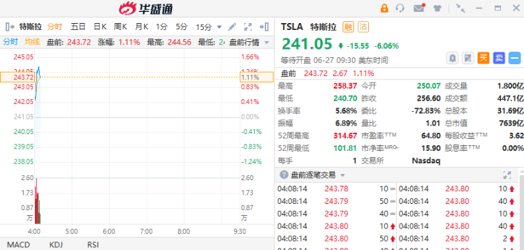 特斯拉盘前涨超1%,报243.72美元。周一木头姐继续减仓特斯拉,卖出超过8200股,按收盘价计算价值近200万美元。