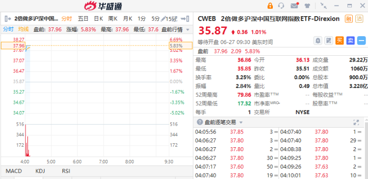 ETF方面,2倍做多沪深中国互联网指数ETF $CWEB 涨近6%,3倍做多富时50指数ETF $YINN 涨超5%。