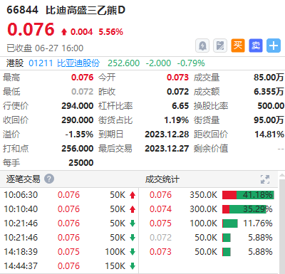 资金流向:观察个股轮证资金流向,比亚迪好仓于上周三至本周一的3个交易日皆录得资金流入,合共约550万。