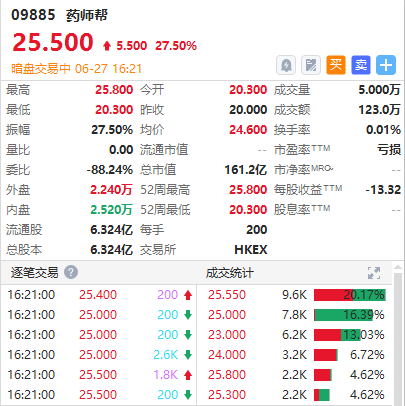 华盛资讯6月27日讯,药师帮暗盘现涨27.5%报25.5港元每股,最新总市值超161.2亿港元,该股预期将于明日(6.28)挂牌上市。