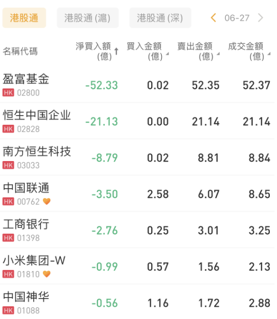 华盛资讯6月27日讯,南向资金今日大幅净卖出73.59亿港元,其中港股通(沪)净卖出43.51亿港元,港股通(深)净卖出30.09亿港元。北向资金今日大幅净卖出25.96亿元。