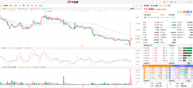 具体而言,当日金力永磁(06680)股价早盘强势拉升,盘中一度涨近55%,随后涨幅震荡缩窄至30%左右,截止收盘其股价守住大涨果实,收涨10.88%。翌日,也就是6月27日,金力永磁股价再度显现上涨之势,上涨3.77%,报于11港元。