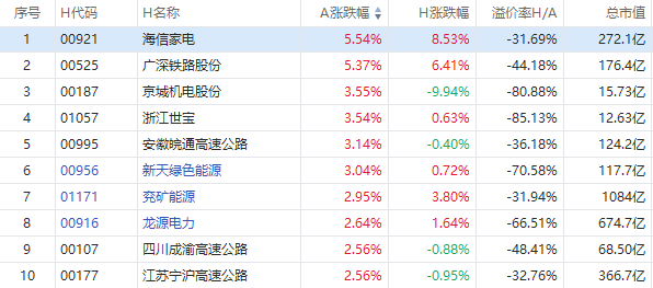 截至发稿,海信家电A股涨5.54%,H股现涨8.53%;浙江世宝A股涨3.54%,H股现涨0.63%;兖矿能源A股涨2.95%,H股现涨3.8%。